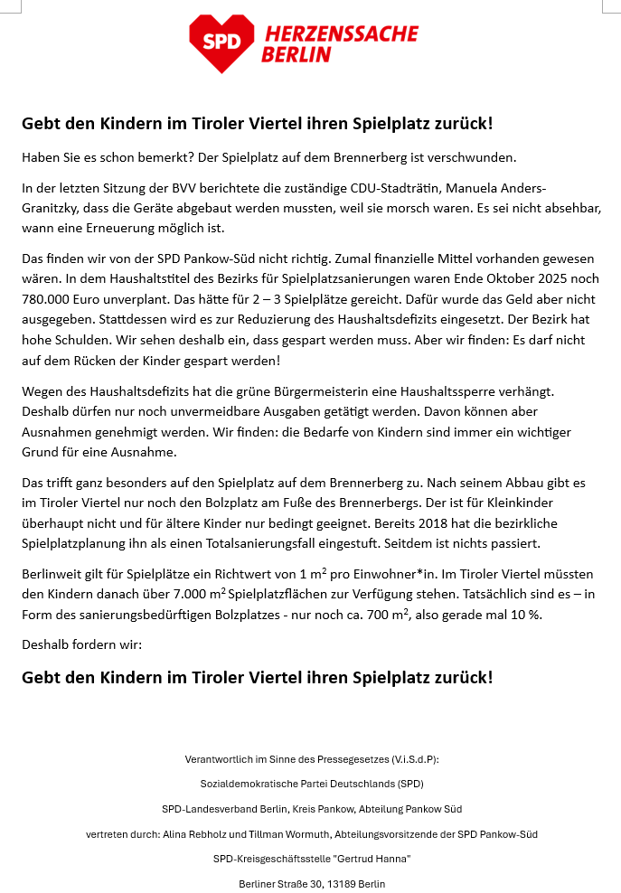 „Ein Spielplatz ohne Spielgeräte – das ist doch absurd! Im kinderreichen Tiroler Viertel wohnen unzählige Familien. Und genau ihnen nimmt man hier die dringend benötigten Spielmöglichkeiten“, empört sich Arne Gröschel, nominiert als SPD-Kandidat* fürs Abgeordnetenhaus. „Familienfreundliche Politik bedeutet, Orte für Kinder zu erhalten und auszubauen – nicht zu zerstören. Der Spielplatz muss zurück!“